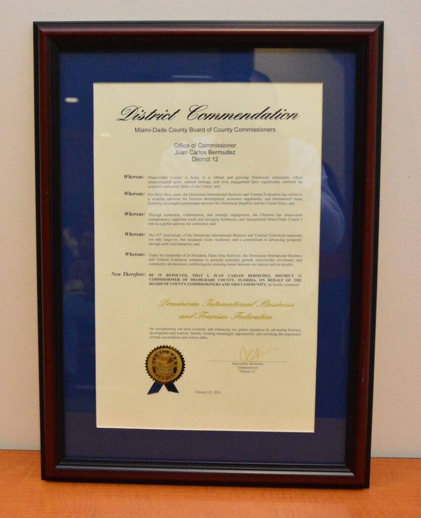 Durante la actividad, Michael G. Fresco, Jr., director del Distrito 12, en representación del Comisionado del Condado Miami-Dade, Juan Carlos Bermúdez, junto a María Dreyfus-Ulvert, Assistant Director–International Liaison de la Oficina de la Alcaldesa del Condado Miami-Dade, Daniela Levine Cava, entregaron una Proclama oficial a Pedro J. Díaz Ballester, presidente de la Cámara, reconociendo su liderazgo empresarial y el 33 aniversario de fundación de la institución, así como sus aportes al desarrollo comunitario y económico.